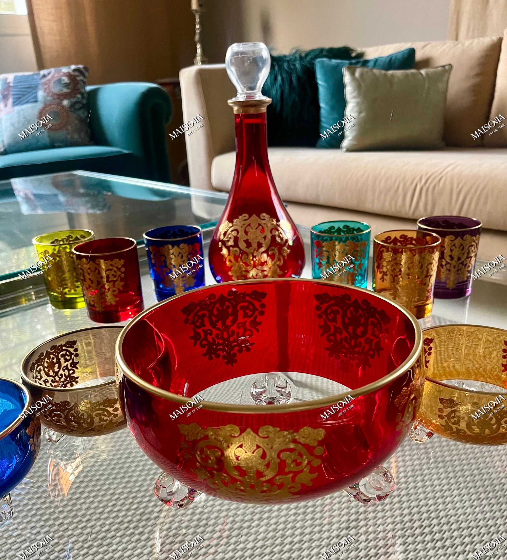إبريق زجاجي كريستالي من المغرب، طقم إبريق وكؤوس متعددة الألوان، أدوات مائدة زجاجية أنيقة، إبريق مصمم خصيصًا للطاولة المغربية الحديثة، إبريق أحمر مع كؤوس ملونة - مثالي للمنزل والاستقبال والهدايا.