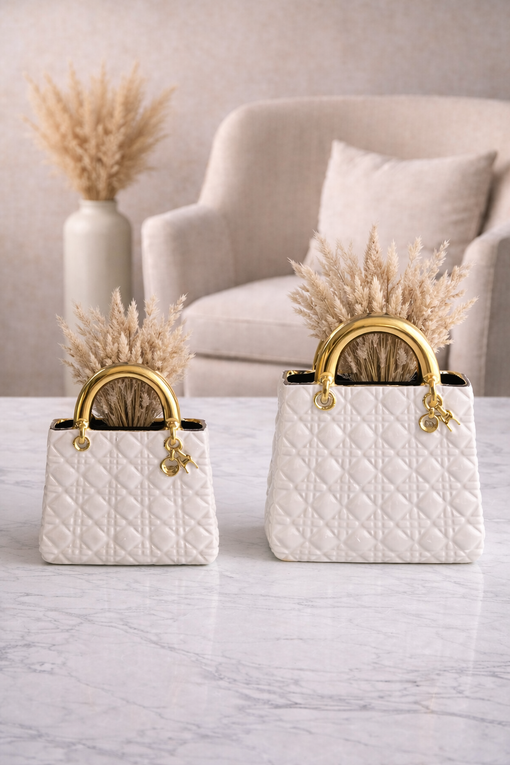Mise en scène dans un univers chaleureux et contemporain, chaque vase s’intègre parfaitement dans une décoration moderne, minimaliste ou chic. Utilisés seuls ou en duo, ils créent une ambiance douce et élégante, tout en mettant en valeur les pampas et fleurs séchées.
