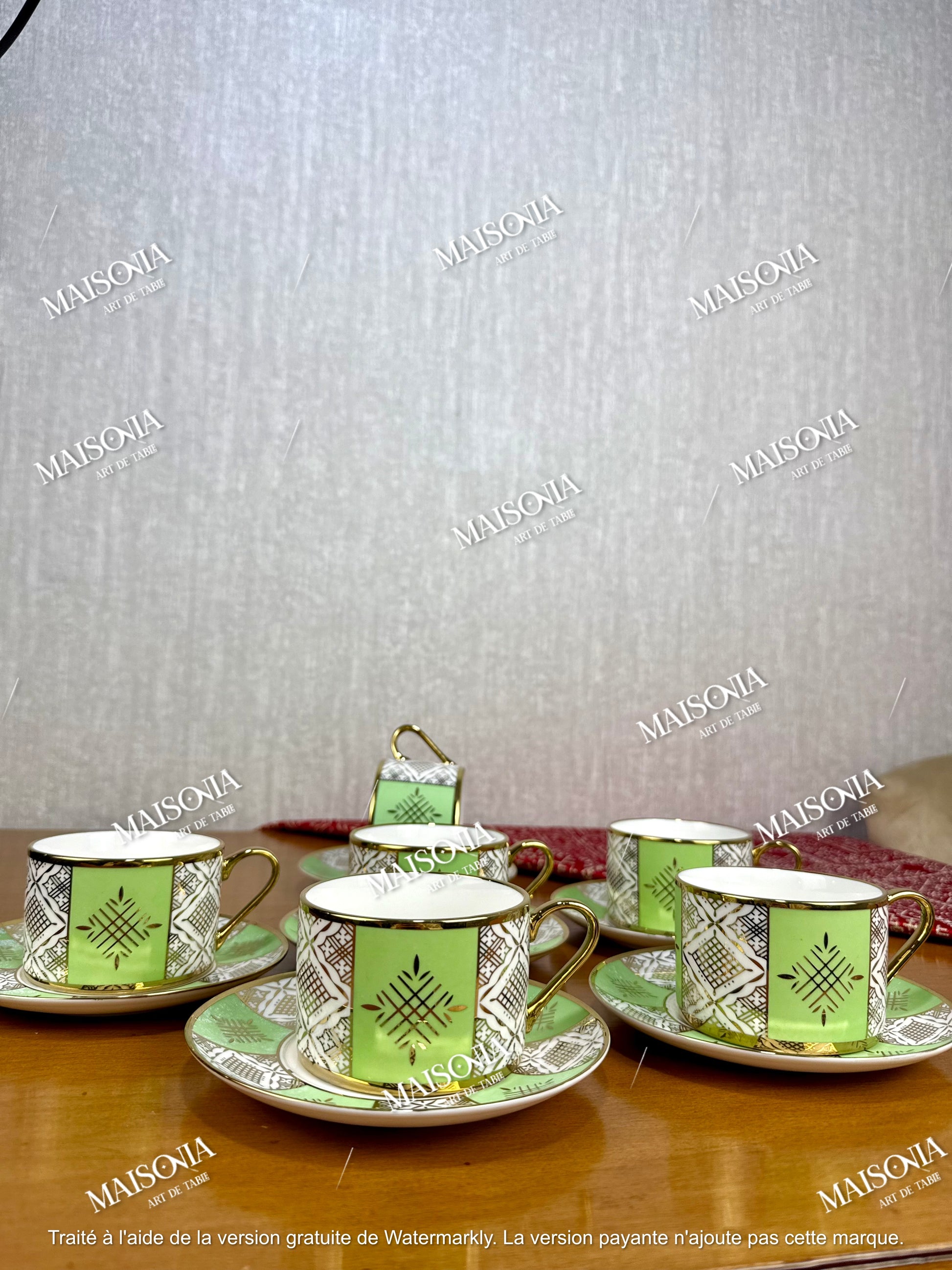 Leur design raffiné associe des motifs géométriques marocains, des couleurs douces et harmonieuses et une finition dorée élégante, idéale pour sublimer le café au lait, le cappuccino ou les boissons chaudes.